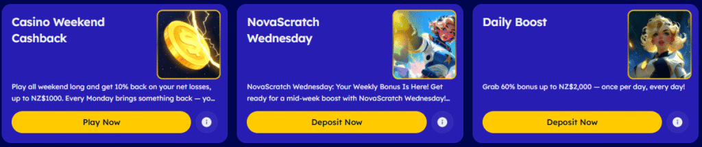Nova Casino provides lots of excitement to New Zealand customers thanks to the new slots that appear regularly. Pragmatic Play casino, Play’n GO and Blueprint are some of the software providers that supply the latest games. You can play for jackpot prizes across some of the networks, and there’s also some quality live dealer casino options.
